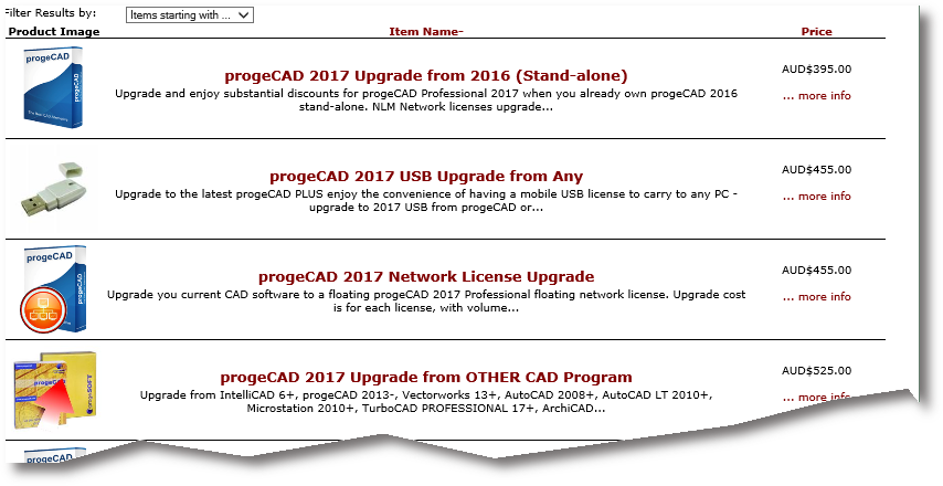 It is possible to upgrade from any type of paid progeCAD license to any other type of paid progeCAD license. Under the "progeCAD Upgrades" category, we see several different types of license that can be selected for the upgrade. progeCAD licenses are upgraded on a one for one exchange basis. That is, for one "older" valid license code (which has not been, for example, already upgraded before), a user is entitled to one upgrade price in the license type of their choice. If a company has multiple licenses, there is no requirement to upgrade all of them, but it would be advisable to do so. Of course, the user does not need to change the license type just to upgrade - they are welcome to keep on the same type as the older one they are upgrading from (e.g. Single). The point is, either way works. Any of the upgrade products will activate the latest version of software (currently progeCAD 2017):